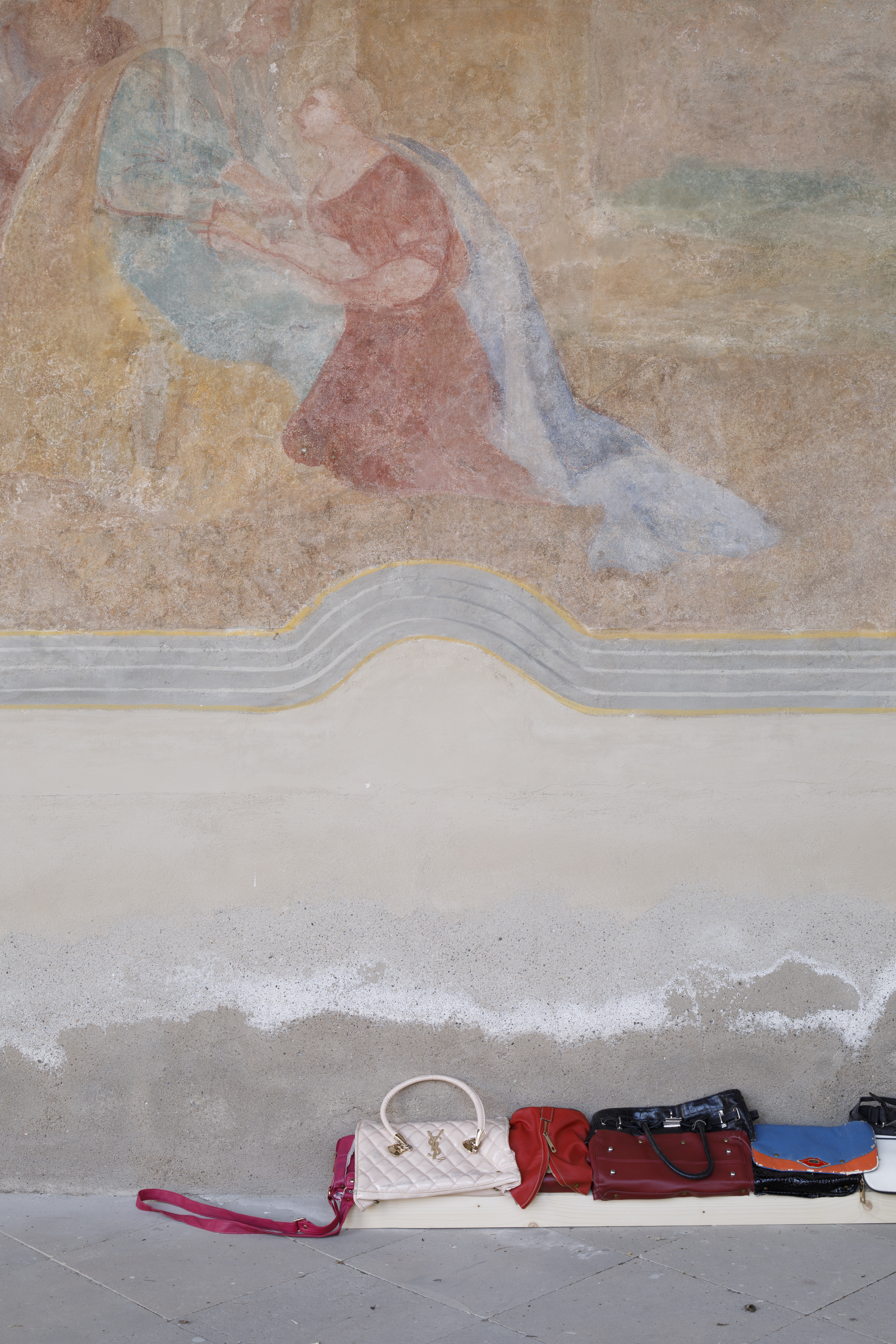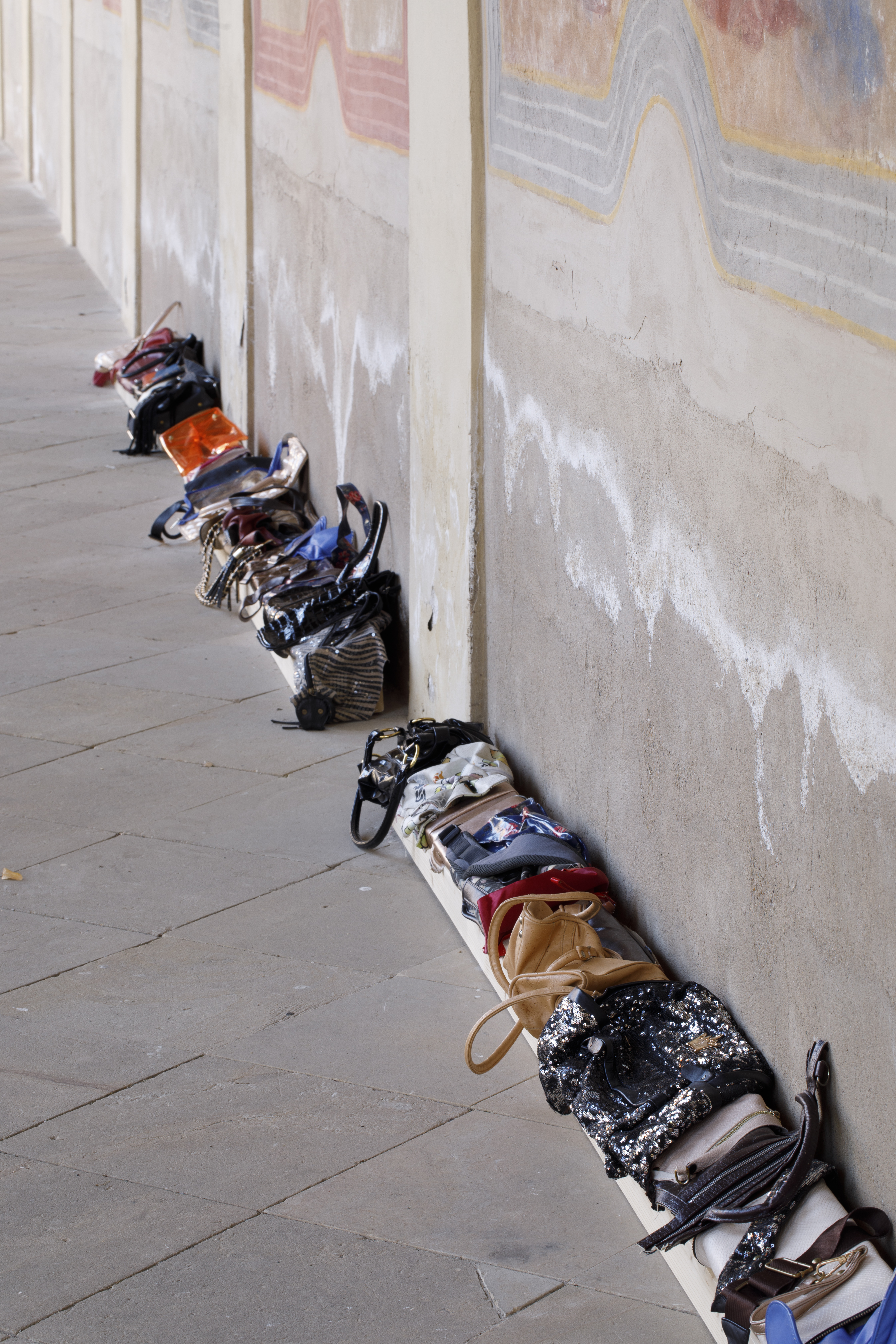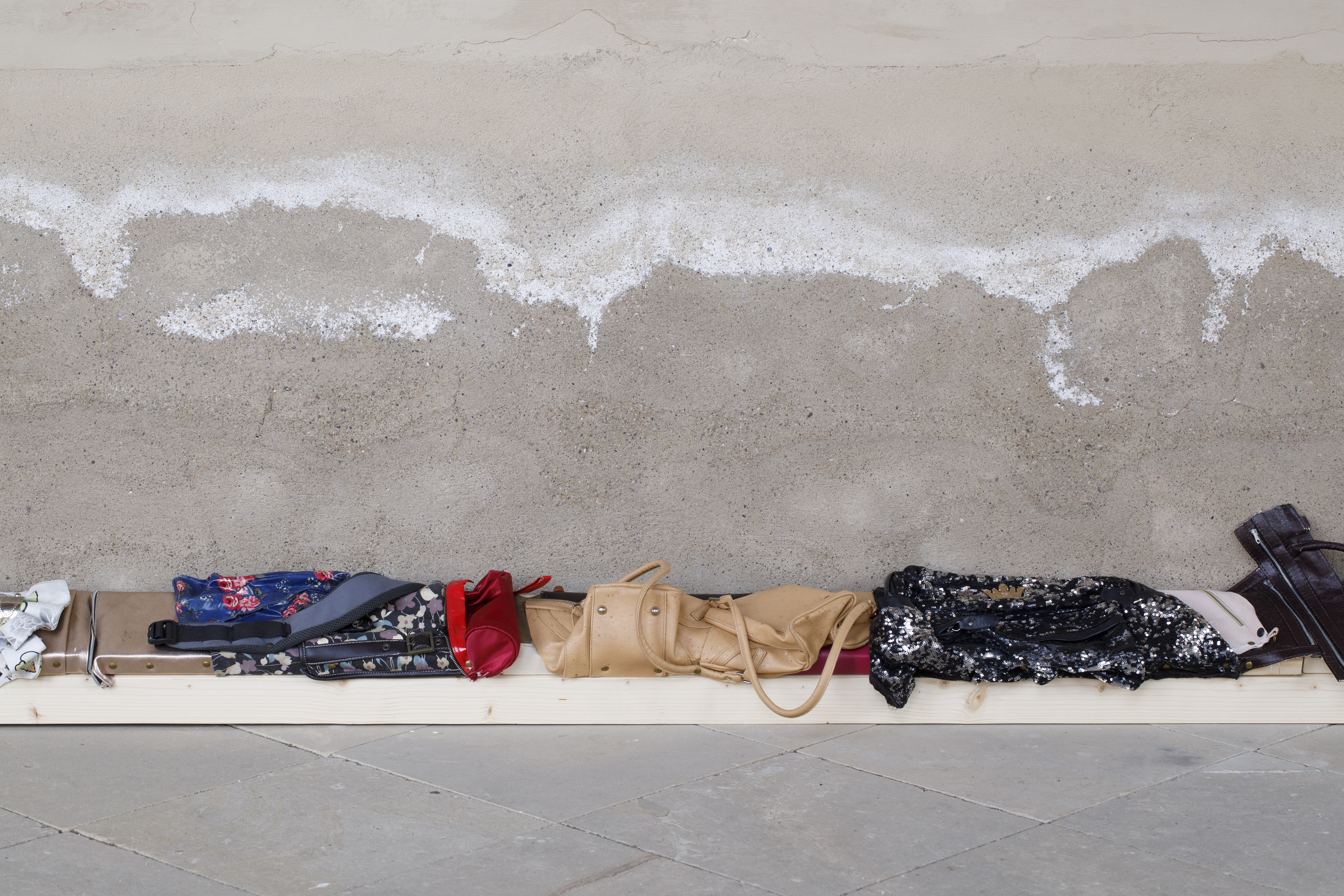 Místně specifická instalace sestavená z obnošených dámských kabelek interpretuje polyfonii prostřednictvím předmětů, které ženy obvykle nosí – a které jsou určeny k nošení jiných věcí. Dílo Bez názvu, 2025 tak jako by dávalo hlas mnoha anonymním ženám. Jak je pro tvorbu Gzirishvili typické, tematizuje otázky třídy, genderu, vykořenění a současné geopolitické situace.